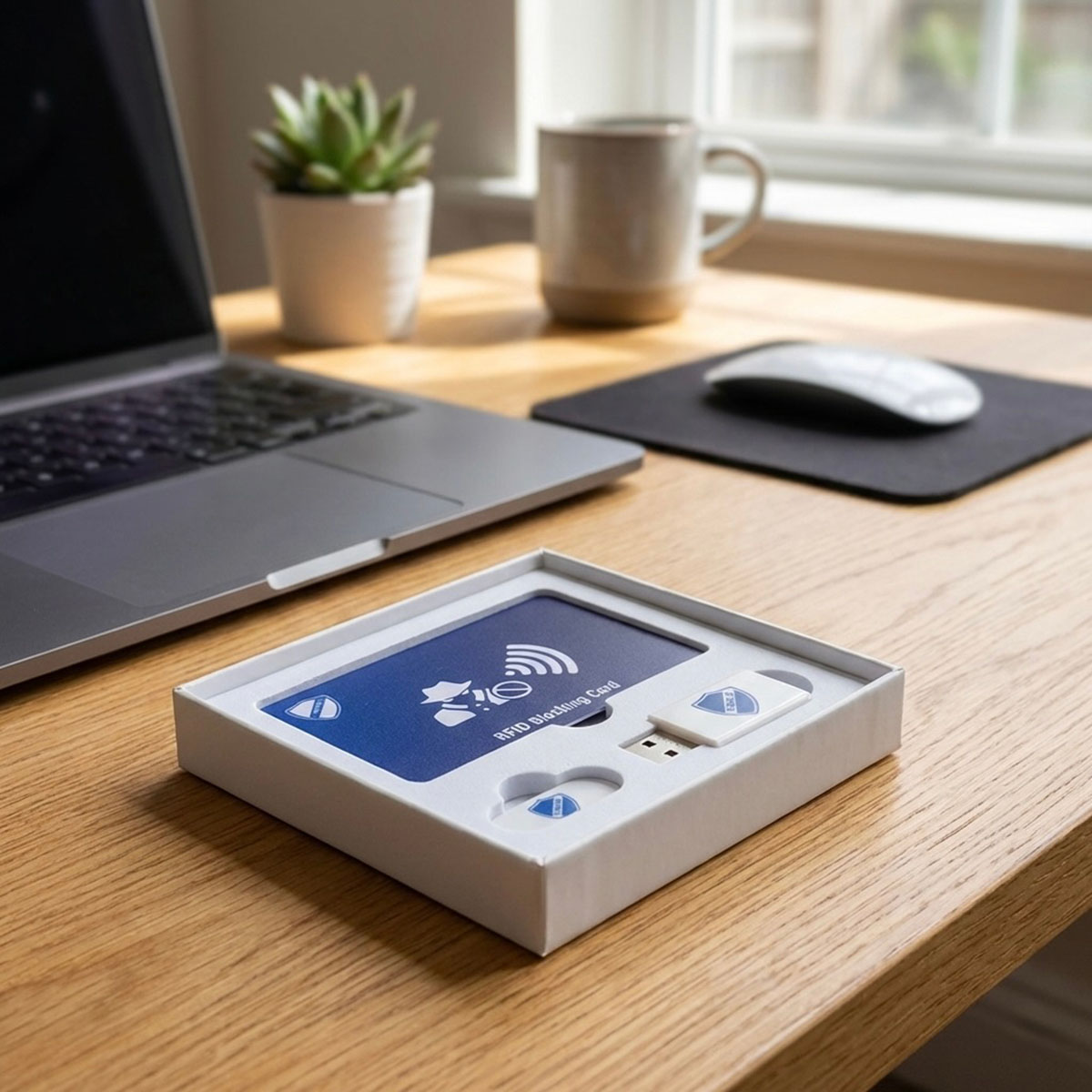 SmartSure is the ultimate security kit for staff and customers! The promotional SmartSure set features a webcam cover, data-blocking adaptor (for secure USB charging) and RFID blocking card to make your cards secure.