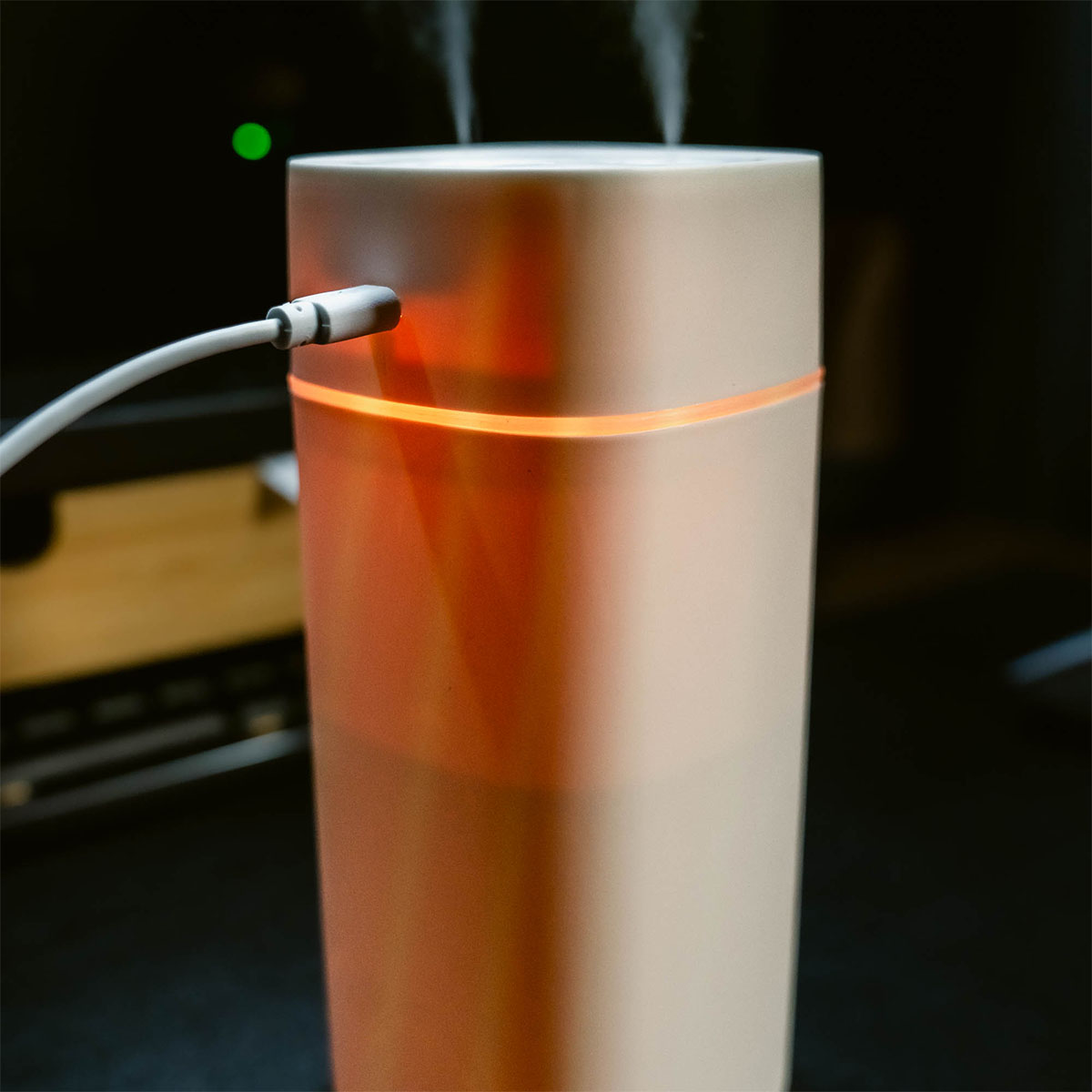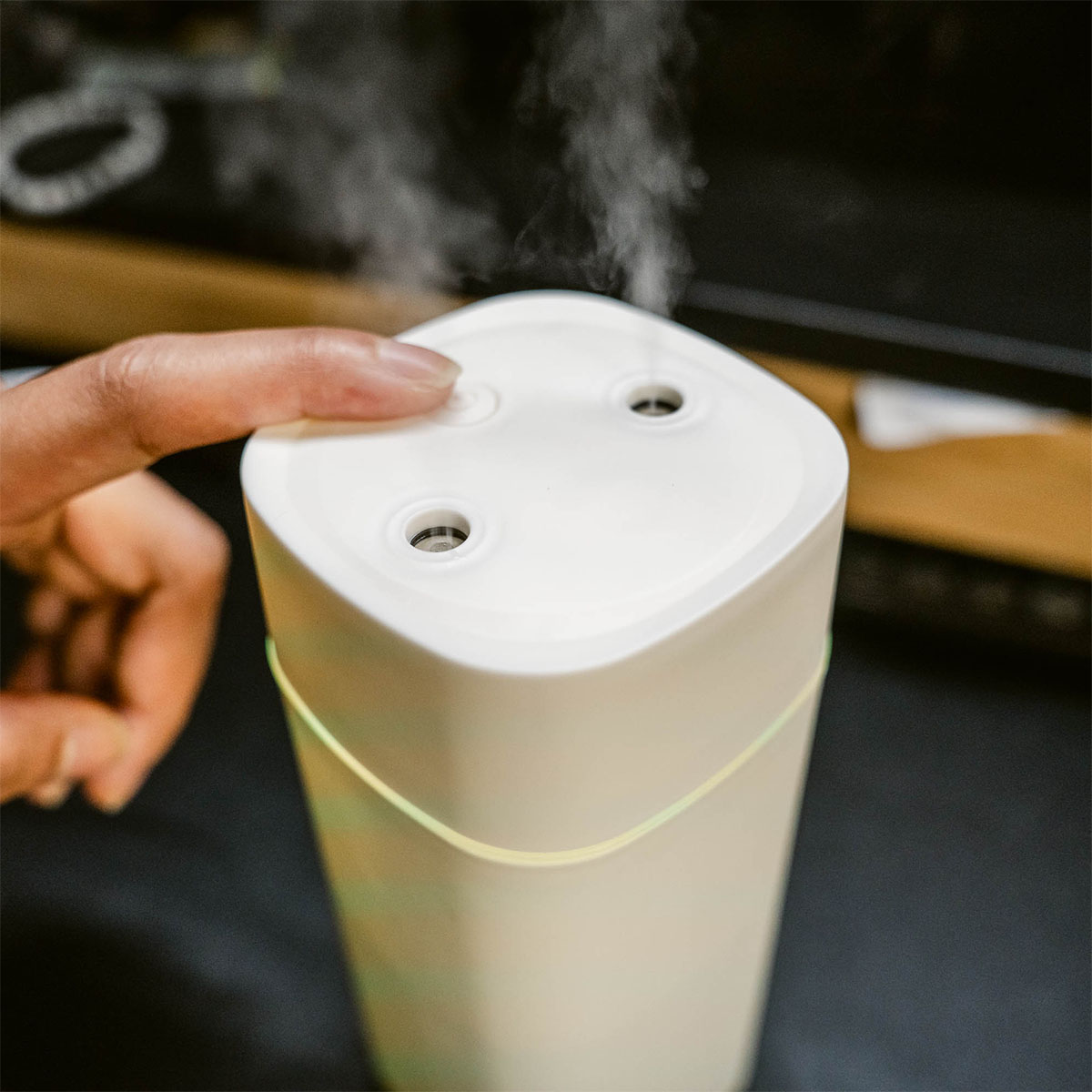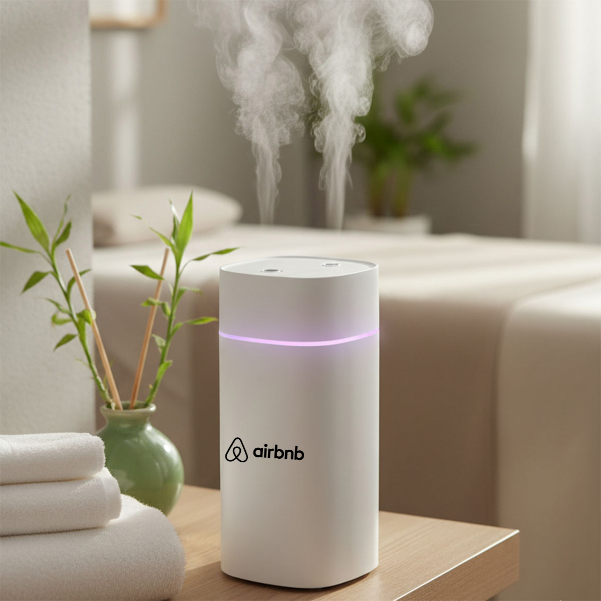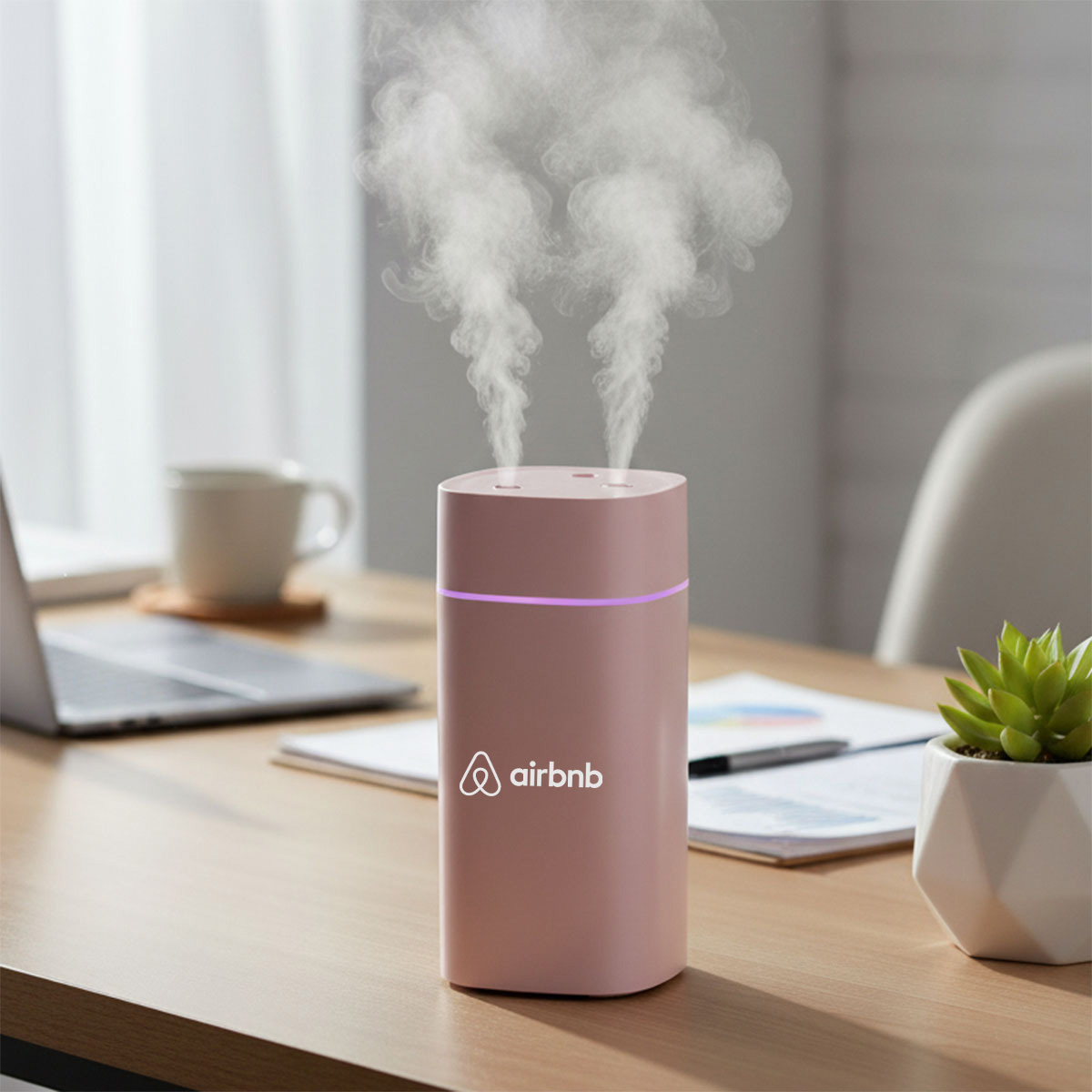 Portable Aroma Diffuser with double-spray design and 600ml tank. Keeps air fresh and skin hydrated. Custom logo printing available. It is the perfect corporate gift.