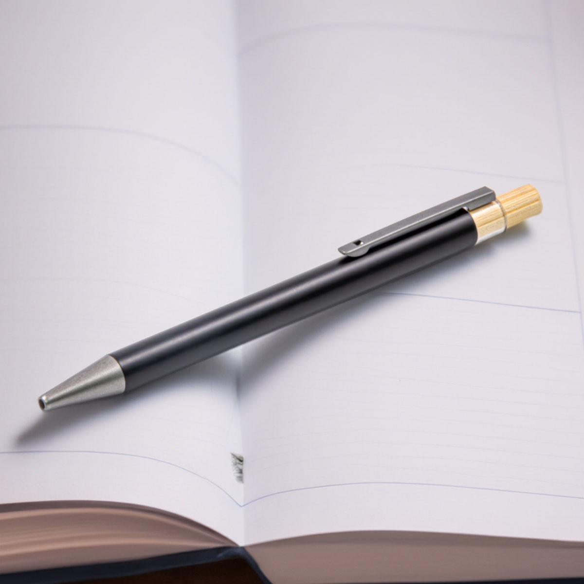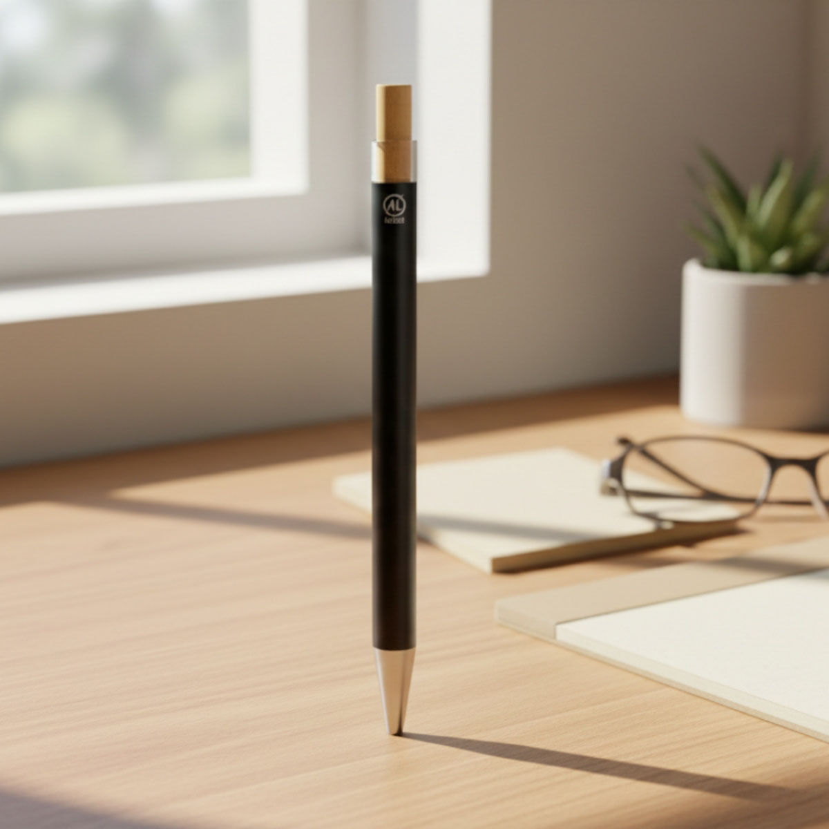 The Flow Pen is an eco friendly gel ink pen made from recycled aluminium and bamboo. With smooth writing performance, a sleek black finish and optional inkless wheat straw refill, it is a premium sustainable choice for corporate gifts and everyday office use.