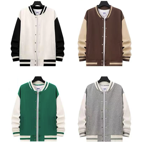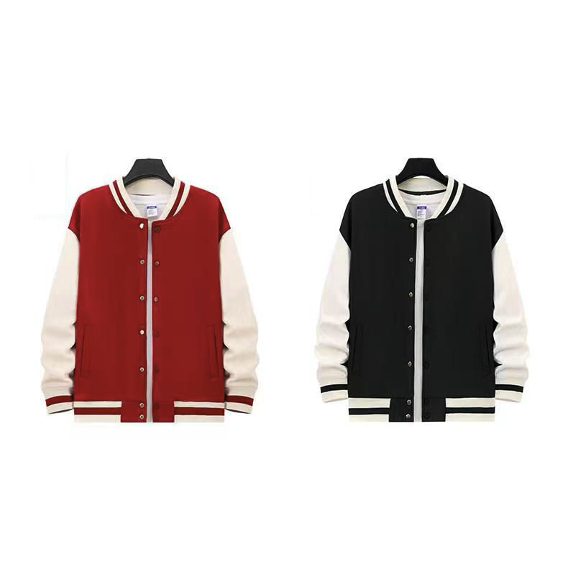 A classical fleece Letterman or Varsity jacket made from 460gsm CVC material (poly-cotton mix). Features a dyed to match twill taped neck, snap front closures and front slash pockets. Choose from white/black, brown/light brown, green/white, grey/white, red/white or black/white.
